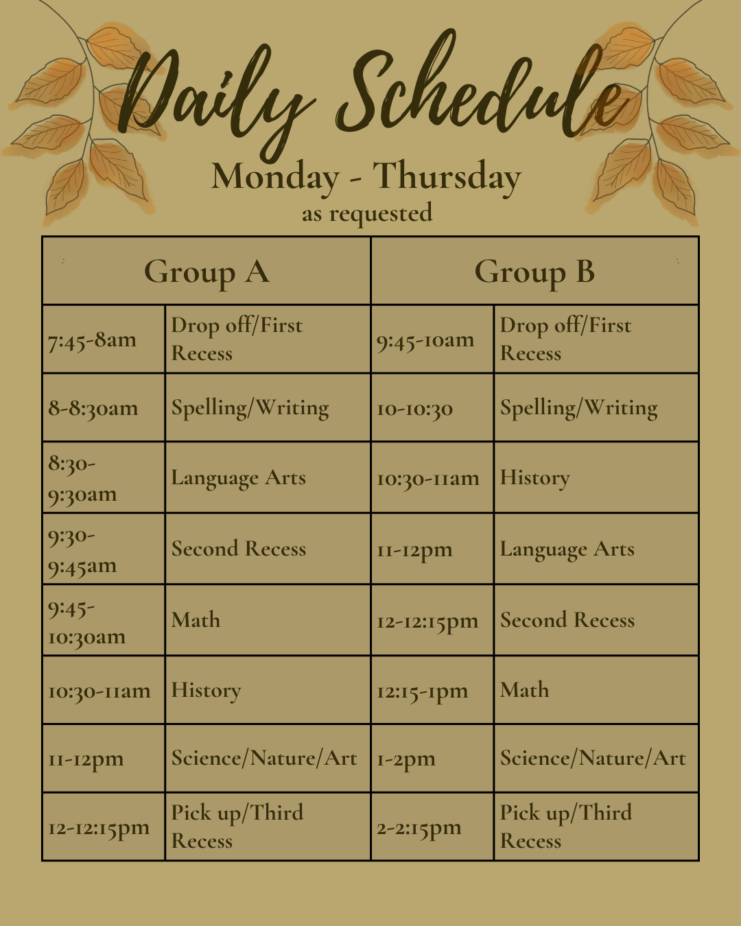 A balanced schedule for families seeking both structure and flexibility. Students build stronger foundations in core subjects while exploring science, art, and nature study across two engaging days each week.